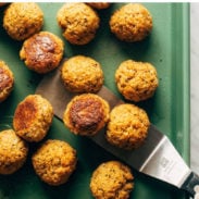 - ADAPTABILITY: Cook once, eat many times. This recipe makes a million and a half meatless meatballs which means that you can use them with many different sauces in many different recipes for years to come. Er, no. Not years. But seriously – you will have a TON of meatballs with this recipe, so start brainstorming serving and/or sauce ideas (and please let the record state that I strongly recommend LIFE CHANGING MASALA SAUCE).