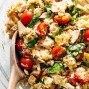 This was great! I could also this recipe being a good one to use up veggies or greens in the fridge that need to be used up ASAP. I subbed the chicken for a can of chickpeas, and subbed the quinoa for a bag of Aldi’s 7-grain mix (prepackaged mix of quinoa, rice, millet, etc.) and used Aldi’s version of the Olive Garden copycat Italian dressing and it tasted amazing!