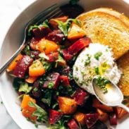 But this salad – or maybe I should say, this big bowl of fried bread, juicy beets and oranges, quick vinaigrette, and creamy, luscious burrata – leaves exactly nothing be desired. The golden crispy-salty bites of the bread with the cool creaminess of the burrata and every juicy, vibrant, dressing-soaked bite of beets and oranges – it’s the total package. It’s a partial fork-and-knife, partial just-get-in-there-and-grab-that-bread-with-your-hands type of meal, which is my favorite kind.