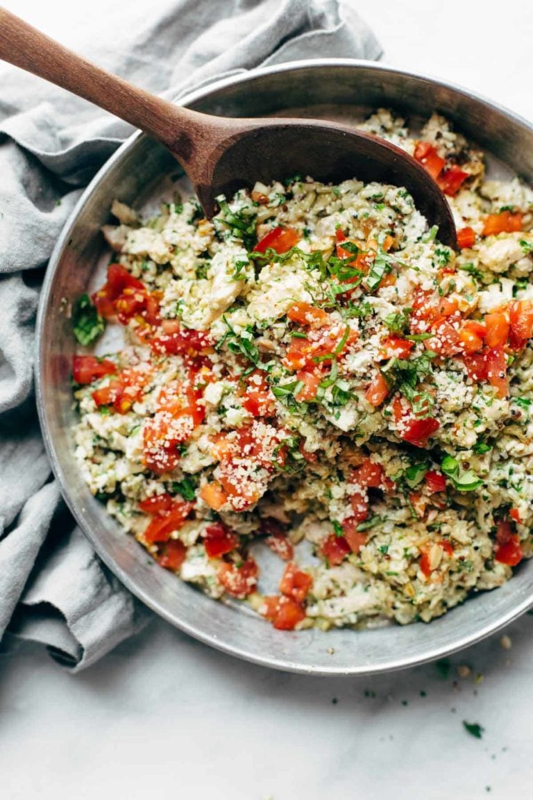 This healthy chicken salad is CREAMY and CLEAN with no mayo! like a cross between herby bruschetta and chicken salad. Super easy, too!