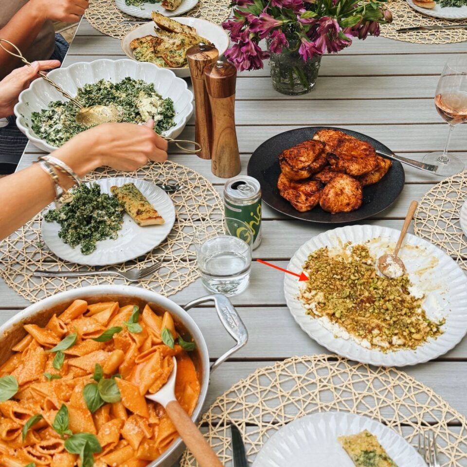 Recipes from my dinner party in the picture above: roasted red pepper pasta, air fryer chicken, house favorite garlic bread, and avocado kale caesar! Also the salad bowl pictured above which I LOVE (affiliate link).