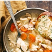 Source Notes: This recipe was inspired by a French bean and chicken stew in the book Jamie Oliver’s Food Escapes (affiliate link) – reading his description about making this in the French countryside sent me straight into the kitchen with a glass of wine and a big soup pot to channel all the country chicken stew vibes. Jamie’s recipe uses the bean soak method which I was unsure about at first, but it really does make the texture of the soup and broth so awesome. According to his notes, you can sub chicken thighs for the whole chicken, but this is a really great (read: easy) gateway into cooking a whole chicken if that’s something that you’re looking to add to your repertoire (not to mention getting some life-changingly delicious broth out of the deal).
