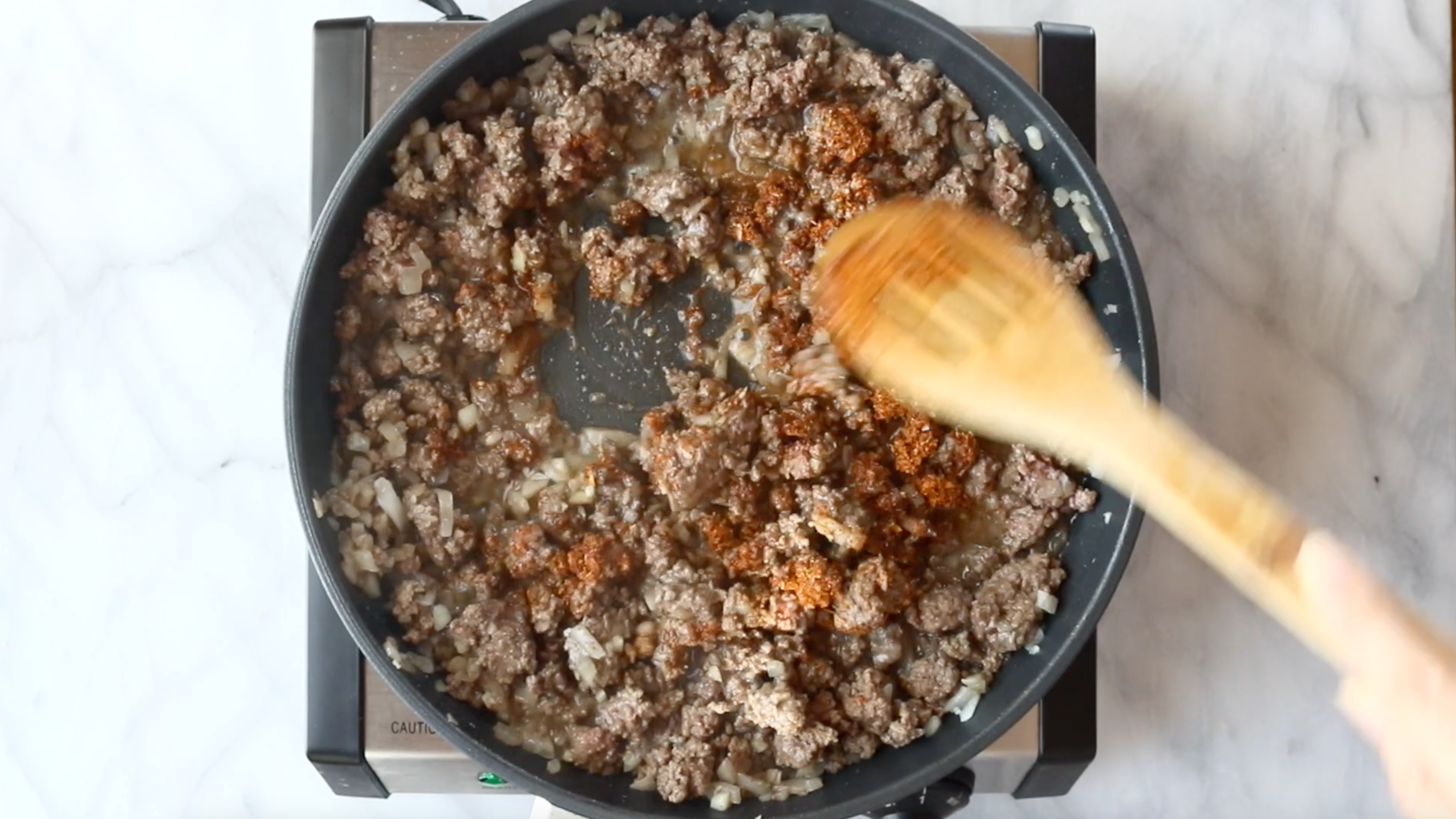 - Spicy Ground Beef: Heat the oil over medium heat in a large nonstick skillet. Add onion, garlic, and beef. Cook / break apart until the beef is browned all the way through. Add taco seasoning and salt.