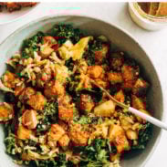 - Toss and serve: Toss up the roasted tempeh, sweet potato, kale, sauerkraut, in a big bowl with any other extras that you like. I mean, RIGHT?! It’s shockingly good.