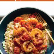 Creamy orzo with the twang of Parmesan, sweet burst tomatoes gently bubbled into a sauce, and a pile of jumbo, delicate, buttery, garlic-laced shrimp. Pass me a glass of wine and I am living my best life.