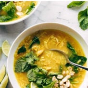 Things I want you to know about healing chicken and rice soup: it is limey, salty, and so fresh. It’s super satisfying thanks to juicy and garlic-ginger-infused chicken thighs and tender jasmine rice, and it can be (read: should be) loaded with fresh herbs and peanuts and more lime juice.