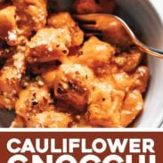 I also really have a weakness for a good creamy / vodka / luscious tomato sauce situation. With pillows of gnocchi. Made out of cauliflower. What is life.