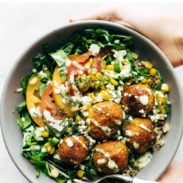Source notes: This recipe was previously titled “Summer Bliss Bowls with Sweet Potato Falafel and Jalapeño Ranch” but was updated in August 2021 to better reflect and respect the cultural origins from which falafel came from. Falafel is a traditional Middle Eastern food that’s typically made from chickpeas, fava beans, or both, and is fried into a ball or fritter shape. Check out this recipe from Suzy at The Mediterranean Dish to make traditional falafel, step by step!