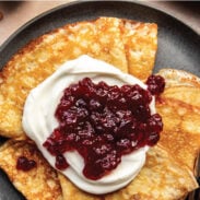 Let’s get right down to it: Swedish pancakes are delightful. This recipe will give you Swedish pancakes that are golden, buttery, chewy and thick enough to sink your teeth into in the middle, but thin enough to give you a signature Swedish pancake thin and lacy edge. It’s like something between an American pancake and a French crepe. Topped with lingonberry jam and yogurt, or whipped cream, or just straight cream?